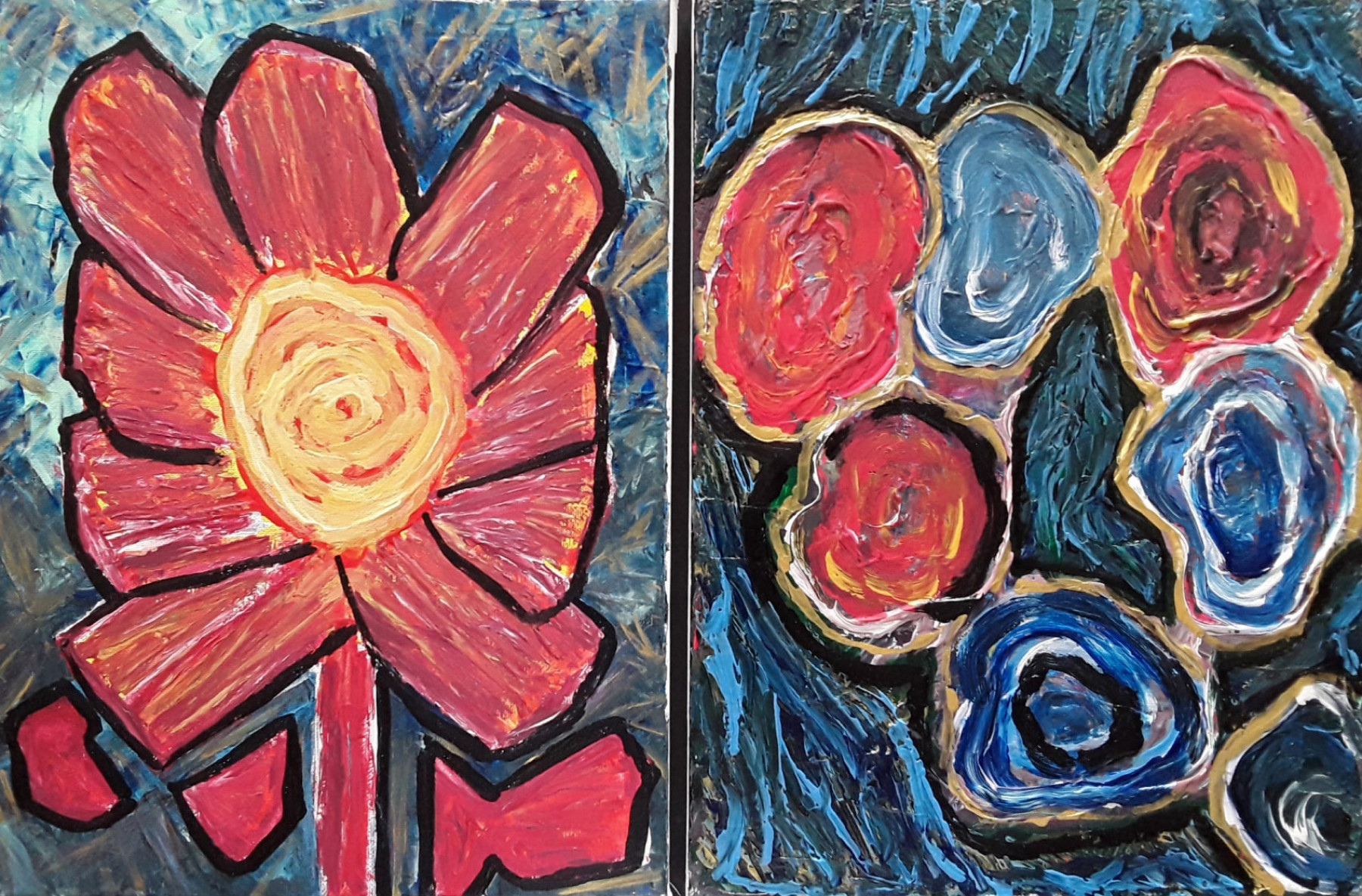 Beschreibung vom Autor:Bei dem Werk handelt es sich um ein Dyptychon (bestehend aus 2 Gemälden jeweils 30cm x 40cm). Der Farbauftrag ist stark sättigend. Die so entstandene Oberfläche ist erhaben und kommt durch die Tiefe einem Relief gleich.